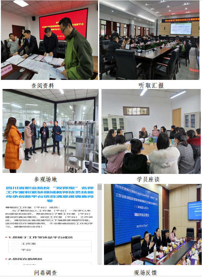 深入现场,调研对象全覆盖。本次调研评估深入现场,6个调研评估小组,24名专家学者分别走进分布在成都、德阳、绵阳、南充、达州等地的四川邮电职业技术学院、四川工程职业技术学院、绵阳职业技术学院、四川省服装艺术学校、达州职业技术学院等22所中高职院校,对我首首批12个职业院校“双师型”名师工作室和15个紧缺领域教师技艺技能传承创新平台开展调查、评估和指导,实现调研对象全覆盖。