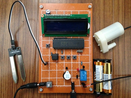 | 简要制作报告 | 定时自动浇花系统:由时间继电器、微型水泵、水管及简单零部件构成,结构简单,容易理解。 土壤湿度检测自动浇花系统:由土壤湿度传感器、单片机控制器、液晶显示器、微型水泵等相关元器件构成,需要自己焊接控制电路板,工作原理简单但焊接控制电路板稍有难度。其原理图如下 | ||||