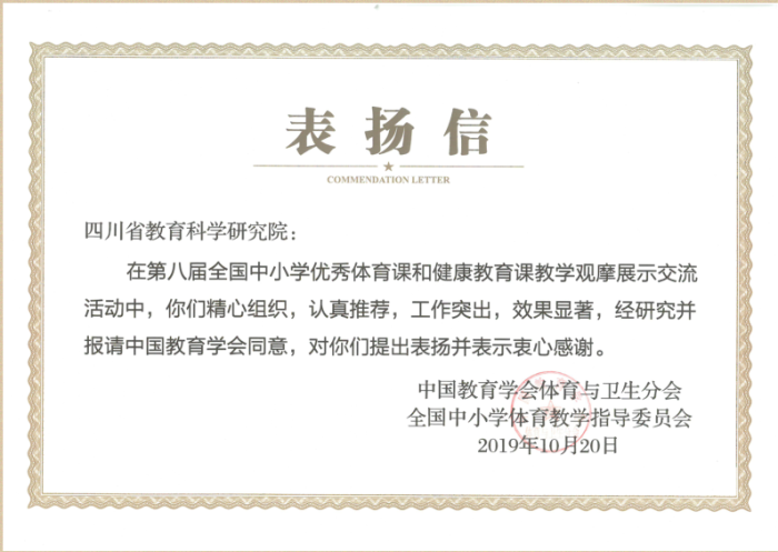 在本次现场课展示观摩交流活动中,有64节体育课和14节健康教育课进行了现场展示,代表了全国中小学体育与健康课的最高水平。其中,来自四川省德阳市中江县实验小学的蒋璞老师及成都、泸州、达州等我省五位教师的体育与健康课通过层层选拔,参加了开幕式展示和现场课展示交流活动。四川省教育厅副巡视员、四川教育学会副会长周雪峰参加了开幕式,四川省教育科学研究院邱永诚老师受邀担任了本次展评活动的点评专家。四川省教育科学研究院在本次活动中,由于组织指导工作突出,效果显著,被大会提出公开表扬,并当场颁发了“表扬信”。